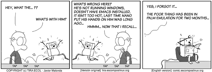 The Ecol comic strip is written for escomposlinux.org (ECOL), the web site tha t supports, es.comp.os.linux, the Spanish USENET newsgroup for Linux. The strips are drawn in Spanish and then translated to English by the author.
